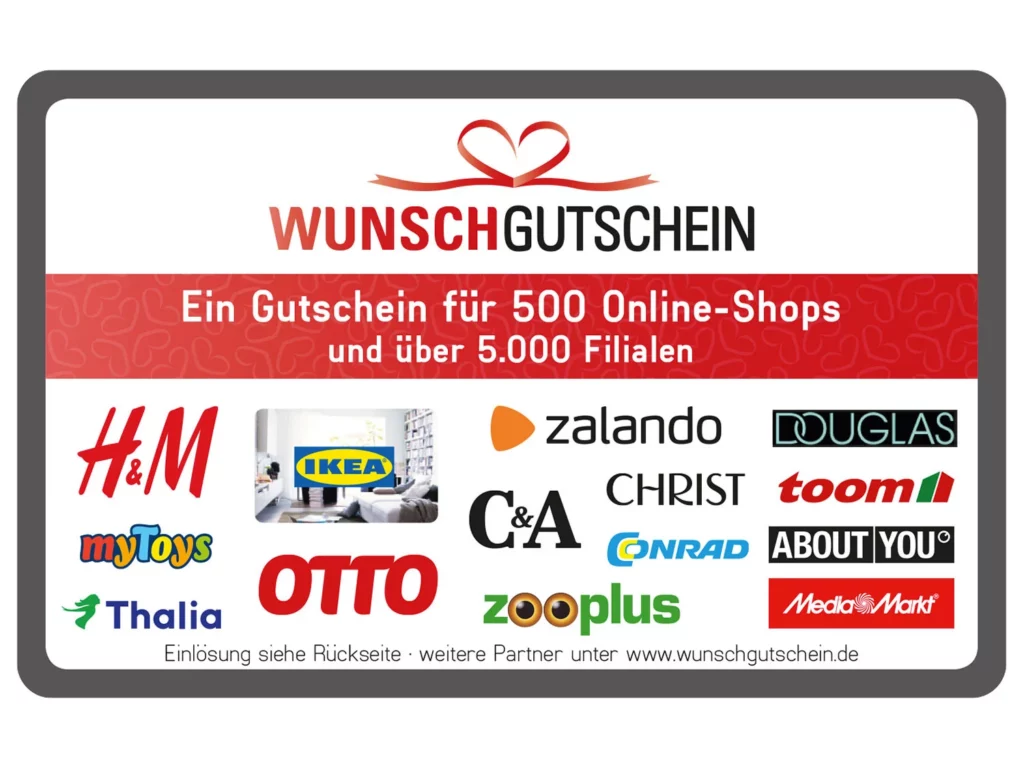 Der Wunschgutschein kann bei verschiedenen Händlern eingelöst werden, je nachdem für welche Variante des Gutscheins Sie sich entschieden haben. Auf der Website des Anbieters können Sie eine Liste der akzeptierenden Händler einsehen. In der Regel sind dies große Einzelhandelsketten, Online-Shops oder Dienstleister wie Otto, Amazon, IKEA, H&M, Douglas, MediaMarkt, REWE, und viele weitere. Es empfiehlt sich jedoch immer, vor dem Einlösen des Gutscheins die jeweiligen Einlösebedingungen des ausgewählten Händlers zu prüfen.
